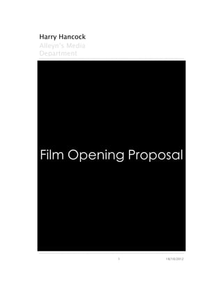 The film opening will depict a young girl's descent into drug and alcohol abuse as she dedicates herself to ballet from ages 4 to 17. It will show her missing out on a normal childhood and struggling with intense physical demands. She begins to question her future and gets attention from peers, eventually being introduced to substances by them. The opening will use unsteady camerawork and hazy effects to portray her hallucinations and breakdown in the shower before the title appears through smoke. Locations will include the girl's dance school and parks near the writer's home, with lighting changing to reflect her deteriorating situation.