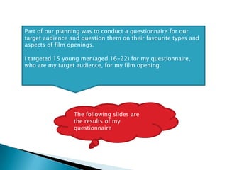 The document describes a film opening questionnaire that was conducted with 15 young men aged 16-22 to understand their preferences and expectations for film openings. The questionnaire asked about what they want and expect to see in a film opening, what makes them continue watching a film, whether a film opening should include a backing track, and what emotions they want to feel when watching a film opening.
