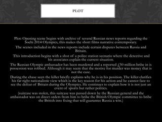 The plot involves the murder of the Russian Olympic ambassador who was in possession of £50 million intended as a bribe for the British Olympic committee. A far-right nationalist killer takes the money and explains he killed the ambassador to prevent a Russian victory over Britain at the Olympics. The detective works to solve the case by putting himself in the killer's mindset. A new lead comes from a phone call placing the ambassador at a previously unknown location. CCTV footage then helps capture the killer, who is prosecuted. Alternatively, the killer is revealed to be the opening scene policeman who framed the detective to improve his rank.