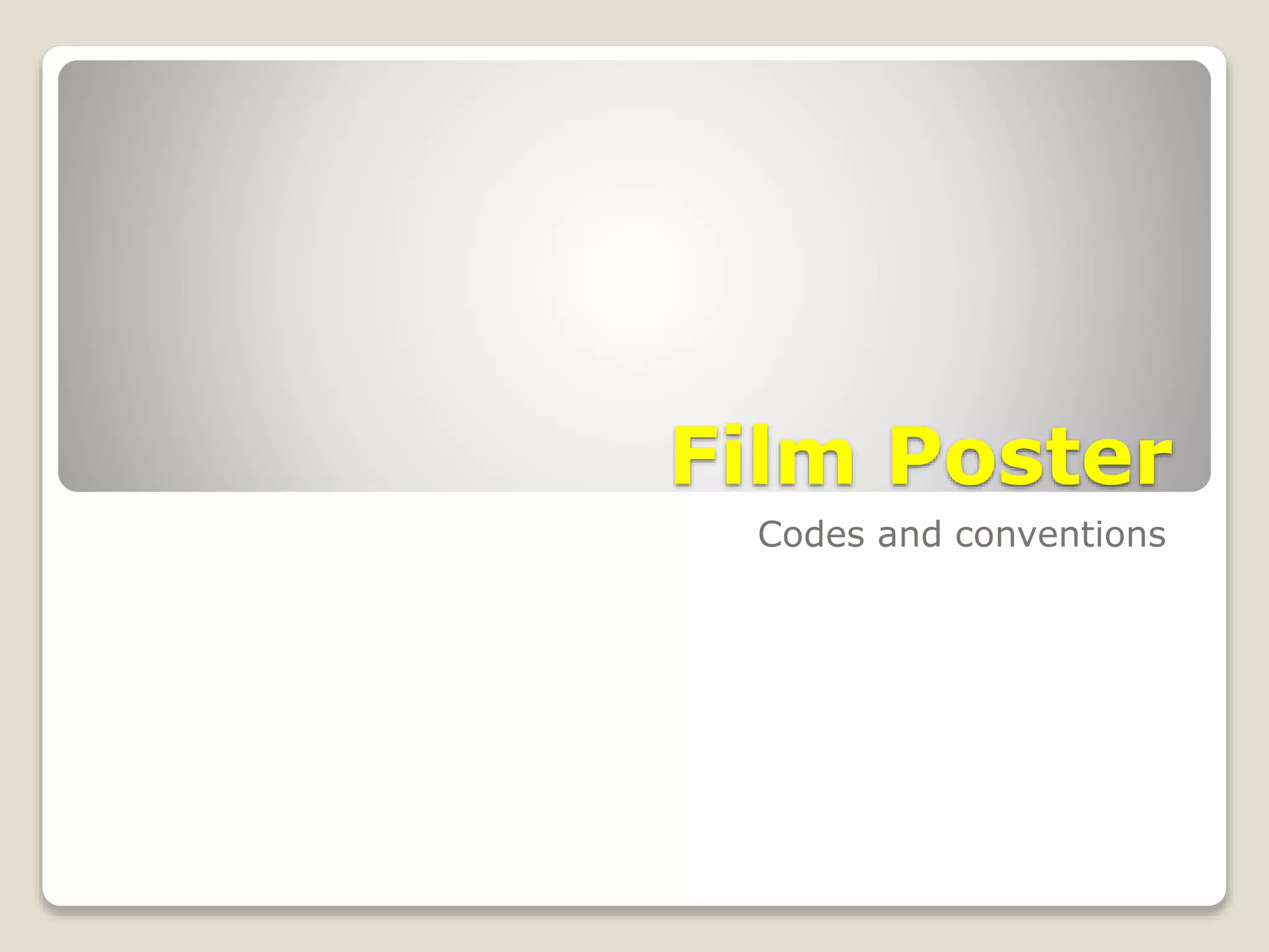 Film posters are used to promote films through eye-catching visuals and information. They typically feature an image from the film to catch viewers' attention and portray the narrative. Titles are usually included to identify the film, unless it is already well known. Popular directors, producers, and actors may have their names prominently displayed to attract audiences. Additional information like quotes, ratings, awards, and release dates are sometimes included to further sell the film. The overall goal is to pique interest and hype for the film through the poster.
