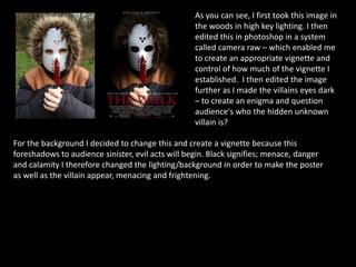 The document analyzes a film poster created by the author. It discusses design choices like using a close-up shot of the villain to create intrigue, applying a vignette to suggest sinister acts, and employing a black, red, and white color scheme common to horror genre posters. Text elements on the poster like production company credits and a slogan are meant to provide context clues about the slasher film's violent and brutal nature. Alignment, composition, and an attention-grabbing title font are aimed to draw the audience's eye to the menacing imagery and reinforce thriller conventions.