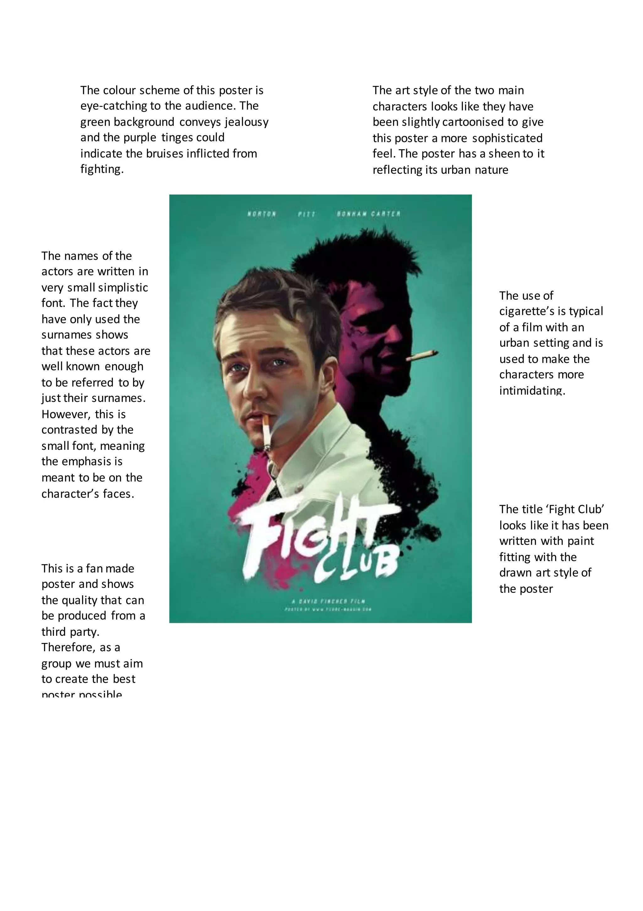This document analyzes and summarizes the design elements of a movie poster for the film "Fight Club". It notes that the poster uses a green and purple color scheme to convey jealousy and bruising. It also comments that the art style slightly cartoons the two main characters to make the poster feel more sophisticated. The names of the actors are in small, simplistic font to emphasize the characters' faces over the actors. Cigarettes, the title styled with paint, and a tagline about a trilogy are used to attract certain audiences. Overall, the poster aims to intrigue viewers about the film through its visual design choices.