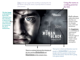 The movie poster depicts a man facing the camera with a look of fear in his eyes, suggesting something is terrifying him. There is a contrast between the clarity of the man's face and the blurred distortion of a woman's face behind him. Dull colors and fogginess create a tense, mysterious atmosphere that reflects the intended scary and eerie mood of the supernatural film. The poster uses the actress's name and a cryptic tagline to promote and generate interest in the ghost-related story.