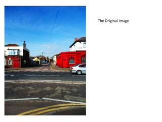 The document summarizes modifications made to a film poster to alter the original image and give the illusion of attacks occurring in the scene. Key alterations included removing buildings and a man from the scene, changing a sign, increasing brightness and color contrast, adding a purple tint and dark clouds to make the sky seem more ominous, and including a nuclear warhead, smoke, and blood to suggest danger and fit the film's theme. Marketing information like a title, website, and logos were also added to provide audiences with more information.