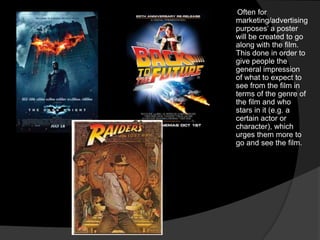 This document discusses different types of film posters and what makes an effective poster. It argues that single image posters with a black background ("SIBB" posters) are most compelling. These posters draw attention with a striking single image and minimal distracting elements. They intrigue viewers about the film's content without revealing too much. The document also praises painted posters and taglines for giving films unique identity. In conclusion, the author believes a SIBB-style poster would best represent their group's film as it can be created without professional painting skills.