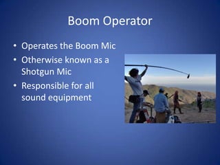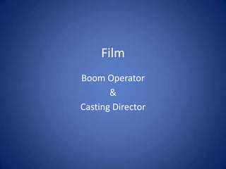 A boom operator operates sound equipment like the boom mic on film sets, requiring excellent hearing, physical stamina, anticipation skills, memory, and attention to detail. A casting director works with the director to find potential actors for roles and brings them to key film staff for consideration, needing an eye for talent, good memory, and patience. Both roles require diplomacy, flexibility, and an understanding of health and safety procedures on film sets.