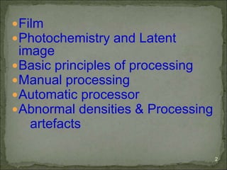 This document provides information on the process of film development. It discusses the components of x-ray film, including the silver halide crystals and sensitivity specks that form the latent image. It describes the chemical and light-induced processes that create this invisible image. The stages of film processing are outlined, including development, rinsing, fixing, washing and drying. Details are given on the chemical constituents and functions of developers, stop baths, fixers and other processing solutions. Factors that influence development such as temperature, time and chemical concentrations are also summarized.