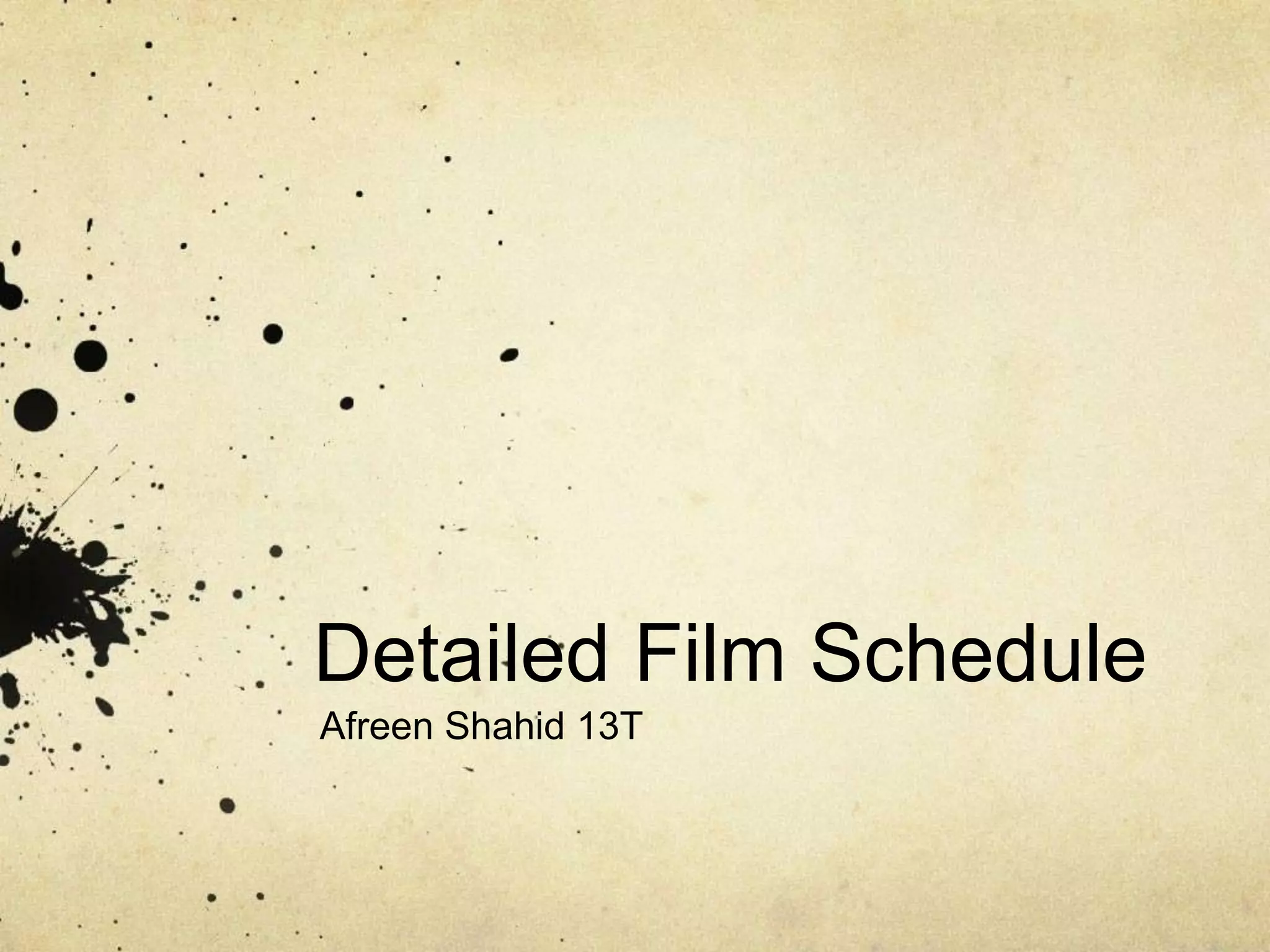 The document provides a detailed film schedule for Afreen Shahid's 13T class project over 4 days:
