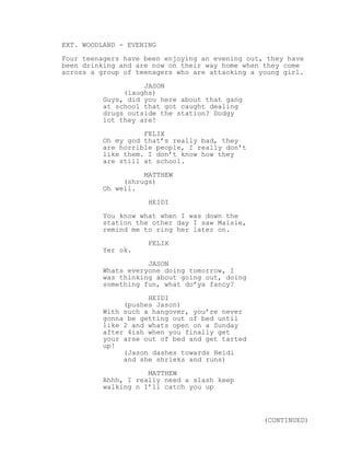 This screenplay follows four teenagers, Felix, Jason, Heidi, and Matthew who witness an attack in the woods one evening. Felix wants to help the victim but the others insist they flee. Later, Matthew's behavior becomes suspicious and the police question the teens, accusing Felix of involvement in the attack. The screenplay ends with Felix protesting her innocence while being held in a jail cell.
