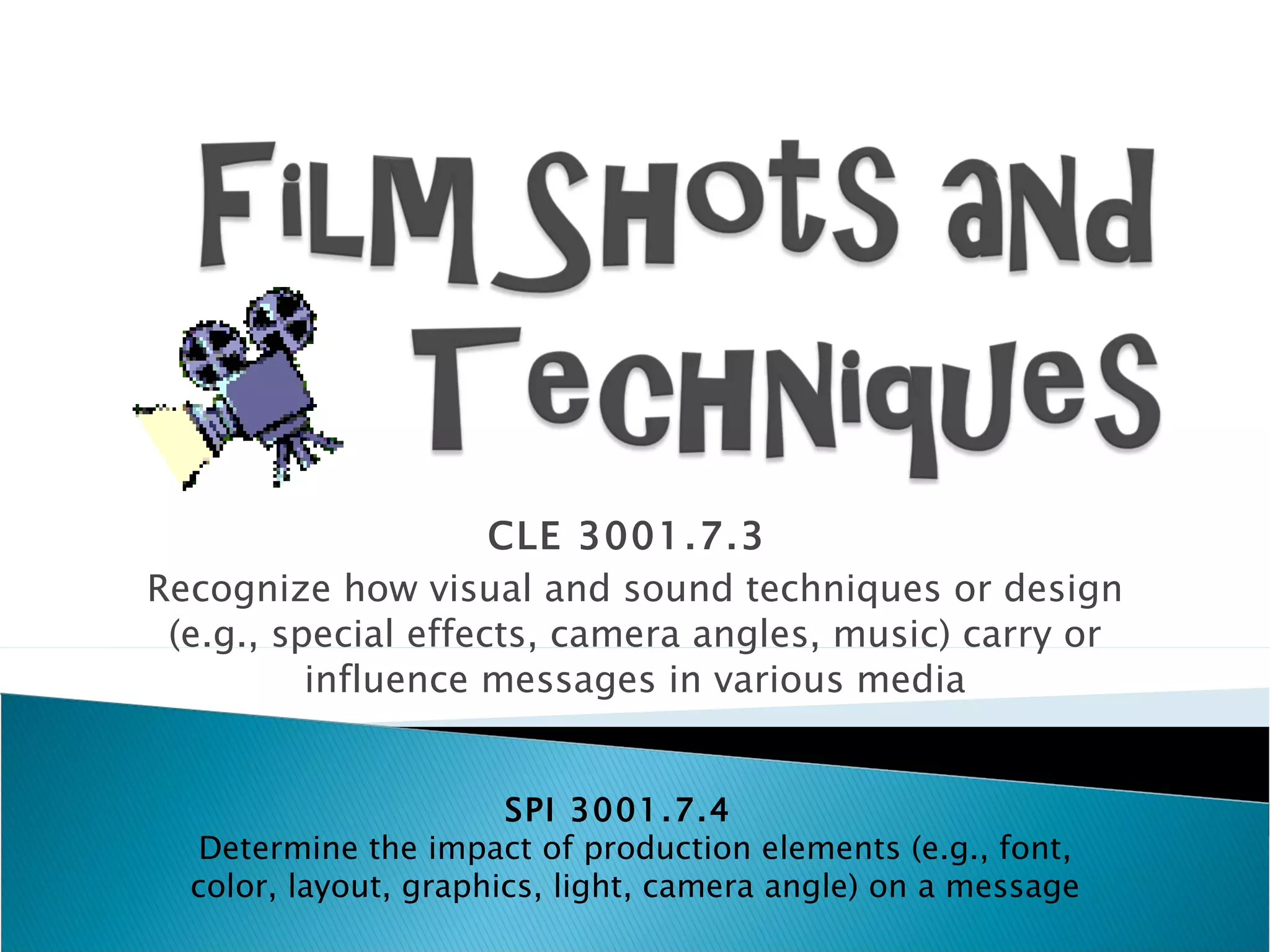 The document defines and describes various cinematography techniques used in film including shots (establishing shot, long shot, medium shot, close-up), camera angles (eye-level, high angle, low angle), camera movements (pan, zoom, tilt, dolly/tracking, boom/crane), lighting (high key, low key, bottom lighting/low lighting, front/rear lighting) and how they can influence messages and impact production elements like font, color and layout. Students will analyze the film To Kill a Mockingbird using these techniques.