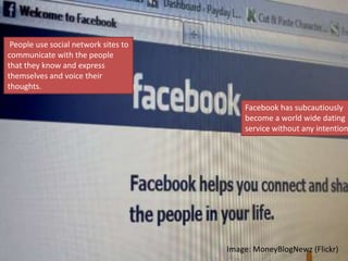 People use social media like Facebook to communicate with people they know and express themselves. Facebook has become a worldwide dating service without intending to, as it allows people to learn about potential partners. How people display their relationships on Facebook through their profile and status can influence relationship commitment levels in real life.