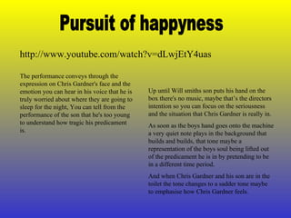 The document discusses the 2006 film The Pursuit of Happyness, which is based on the true story of Chris Gardner, a man who struggled with homelessness while caring for his young son. The film depicts a scene where Chris and his son have nowhere to sleep for the night and are worried about their situation. Through Will Smith's performance as Chris, the viewer senses his worry, while the son is too young to understand the severity of their predicament. The film's soundtrack and music are used to convey emotion and emphasize Chris's feelings of sadness and hope to lift his son's spirit.