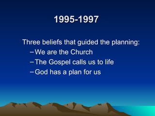 This document outlines the mission and vision planning process of the Church of San Bernardino from 1995-1997. It identifies key beliefs and longings that guided planning, including celebrating diversity, empowering leadership, and renewing families. The resulting vision calls the church to impact families, neighborhoods, and society by filling people's lives with hope in key areas like youth evangelization, unity in diversity, stewardship, and leadership.