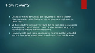 The document summarizes the filming day for a student film project. It discusses how the students followed their storyboard but found additional shot opportunities. Throughout the day, they got more creative and added shots while still sticking to the overall storyboard. It describes some specific shots that were added, like a close-up of a character's feet walking. The document also notes some technical problems encountered, like accidentally turning off exposure lock, and how the filmmaker gained skills in lighting, camera settings, and efficient production.
