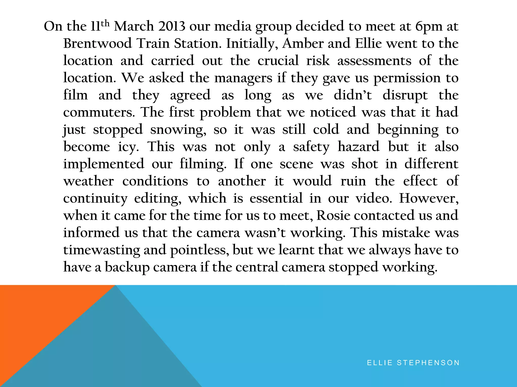 The document summarizes a film crew's efforts to film a scene at a train station for a student thriller video. On their first attempt, they had to reschedule due to snowy and icy conditions. At their second attempt, they methodically filmed different shots of an actress portraying a character experiencing a mental breakdown at the station. One effective shot involved having the actress run away just as a real train passed through. Though challenges arose, the document's author believes the train station scene will be very engaging for viewers due to its realism and unanswered questions about the character's fate.