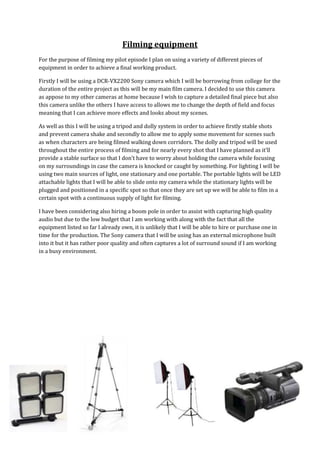 For his pilot episode filming, the document outlines the equipment that will be used which includes: