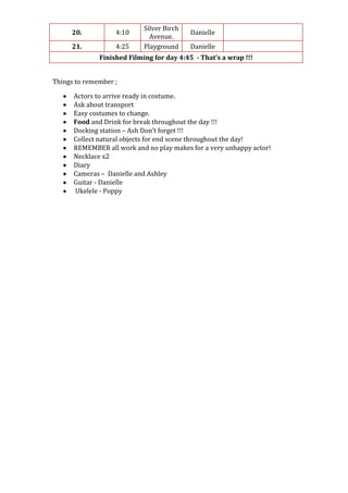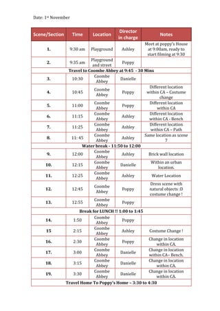 The document contains a filming schedule for November 1st. It details 21 scenes to be shot at various locations within Coombe Abbey between 9:30am and 4:45pm. The schedule lists the time, location, director and notes for each scene. It also includes details about travel, costume changes, breaks for food and drink, and props needed. The goal is to have fun while completing the filming for the day.