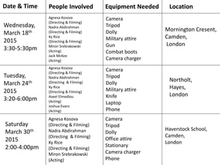 This document outlines the schedule, crew, equipment, and locations for three film shoots taking place on March 18th, 24th, and 30th. Agnesa Kosova, Nadra Abdirahman, and Ky Rice will direct and film all three shoots. The shoots will feature actors Miron Srebrakowski, Jack McKee, Aseel Elmedlou, and Joshua Evans. Equipment such as cameras, tripods, dollies, and props including military attire, guns, and office supplies will be used. The locations will be in Mornington Cresent, Northolt, and Haverstock School, all in London.