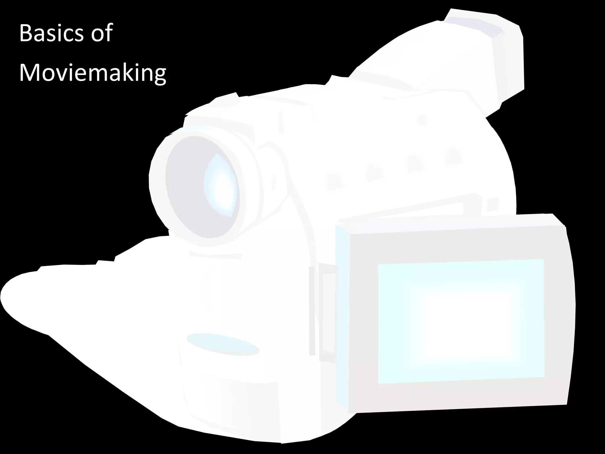 The document provides guidance on basic moviemaking techniques including necessary equipment, camera handling tips, types of shots, angles, distances, and shooting techniques. It discusses software, camera care, establishing shots, close-ups, panning, tilting, zooming, and capturing different levels and angles. Sound equipment options like lavalier and cardioid microphones are also mentioned. Proper camera operation and shot composition are emphasized to help teach students moviemaking skills.