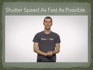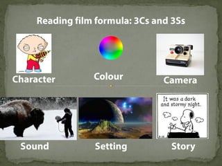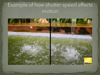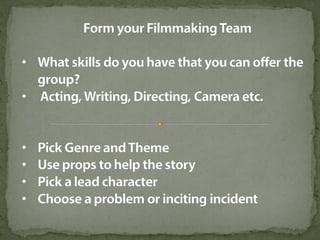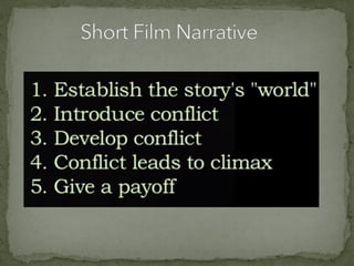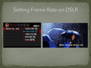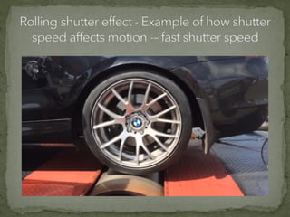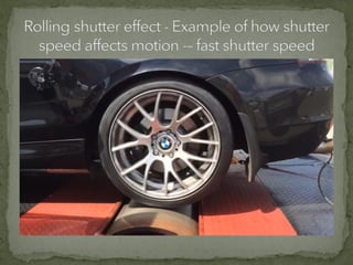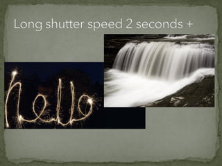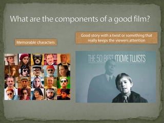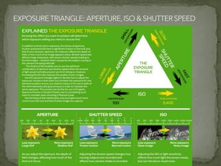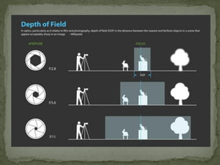 The document discusses various film shots and techniques that are essential in cinematic storytelling, including close-ups, establishing shots, and high and low angle shots, each with iconic examples. It also covers fundamental camera settings like aperture, shutter speed, and ISO, which impact exposure and image quality. Additionally, the document introduces the concept of the rule of thirds and provides insights on sound effects and film narrative structure.