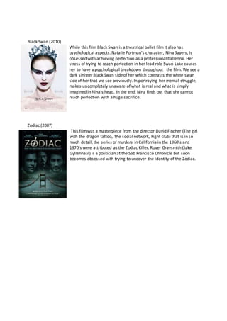 3) Black Swan portrays the psychological breakdown of a ballerina obsessed with perfection through the contrast of her "white swan" and "black swan" personas.