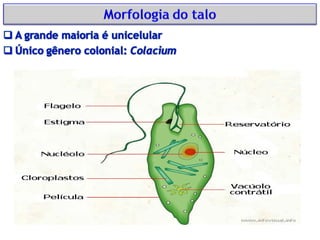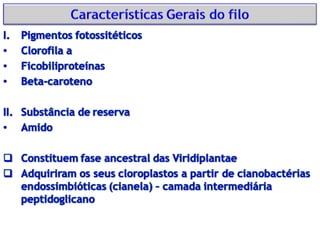 The document discusses several species of glaucophyte algae, including Glaucocystis nostochinearum, Cyanophora paradoxa, and the genus Gloeochaete. It provides links to web pages with more information and photos of glaucophytes and euglenoids, including images of the zoospore of Gloeochaete and an algal bloom in a Brazilian lagoon.