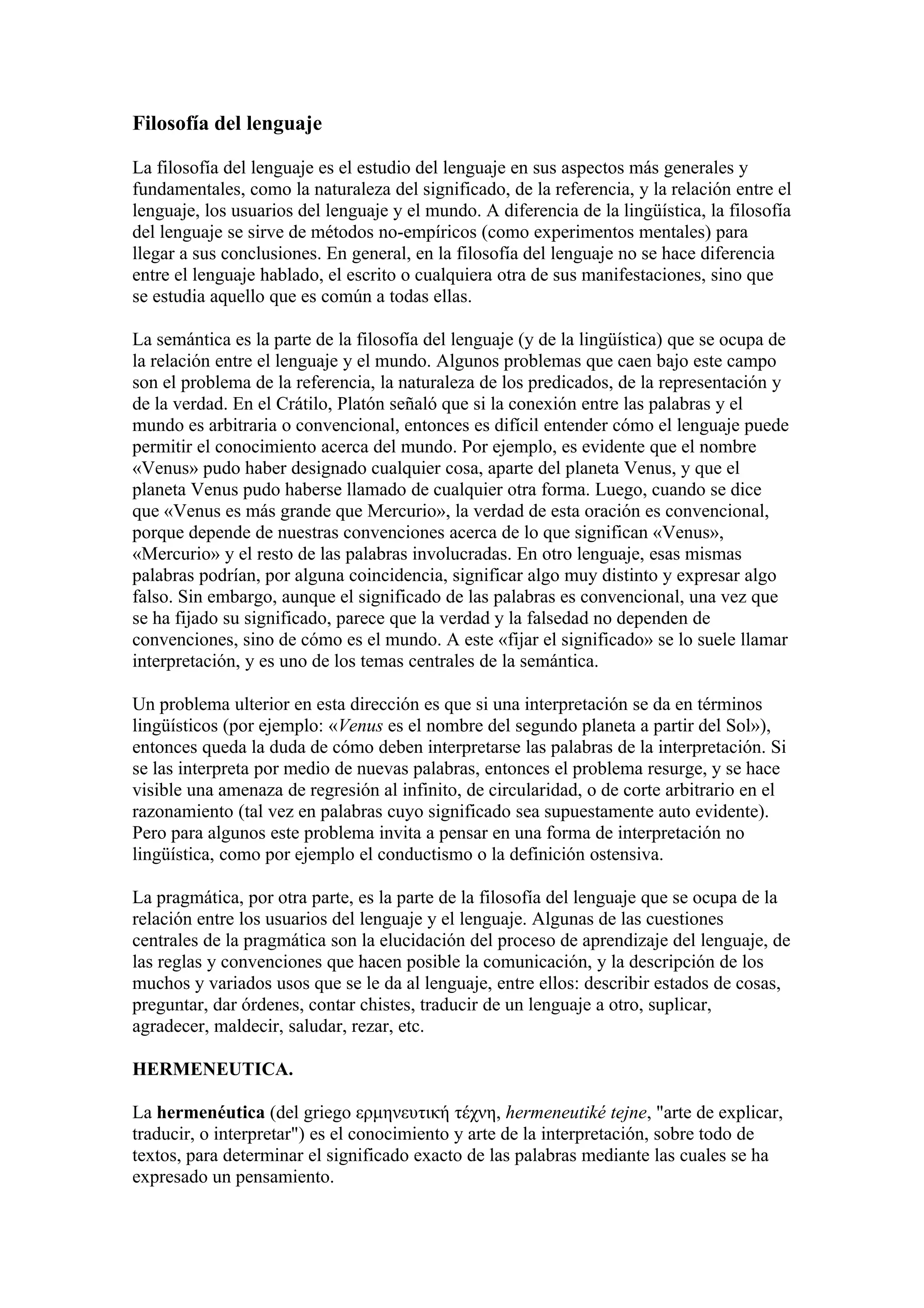 El documento trata sobre la filosofía del lenguaje y la hermenéutica. La filosofía del lenguaje estudia la naturaleza del significado y la relación entre lenguaje, usuarios y el mundo. La semántica se ocupa de la relación entre lenguaje y mundo, mientras la pragmática estudia la relación entre usuarios y lenguaje. La hermenéutica es el arte y conocimiento de la interpretación, especialmente de textos, para determinar el significado exacto. Tiene ramas como la filológica, bíblica