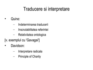 The document discusses various philosophical perspectives on language, focusing on interpretation and translation theories, particularly the positions of Quine and Davidson on indeterminacy and radical interpretation. It critiques the idea of a private language, arguing against Wittgenstein's view by analyzing the necessity of public rules in linguistic practices. Finally, it highlights the challenges in formulating a semantic theory that reliably distinguishes meaningful from meaningless expressions, questioning the feasibility of normative theories in language.