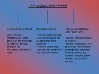 Com definir l’ésserhumàDefinició de l’ésser humàL’ésser humà es caracteritza per estar dotat d’un genoma propi de l’espècie, del qual emergeix una intel·ligència simbòlica i socialUna distinció prèvia Filosofia autobiogràfica: Esforços individuals per respondre les grans qüestions