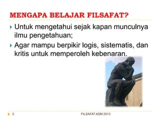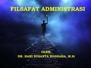 Dokumen ini membahas tentang filsafat administrasi, definisi filsafat, serta perannya dalam memahami kebenaran dan hakikat kehidupan. Filsafat diartikan sebagai cinta terhadap kebenaran, yang meliputi analisis mendalam tentang manusia, alam, dan Tuhan. Proses berpikir filosofis mencakup penggunaan logika, sistematik, radikal, dan universal dalam mencari jawaban atas berbagai masalah.