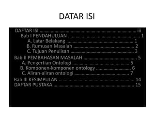 Dokumen ini membahas ontologi, termasuk pengertian, komponen, dan aliran-aliran yang ada dalam disiplin ini. Ontologi, yang berasal dari bahasa Yunani, merupakan ilmu yang mempelajari tentang keberadaan dan realitas konkret. Kesimpulan menggarisbawahi ontologi sebagai cabang filsafat yang mengeksplorasi hubungan antara objek dan pemahaman manusia.