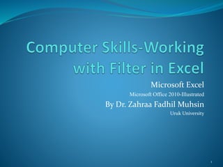 This document discusses how to limit the data shown on a Microsoft Excel worksheet using filters and advanced filters. It explains that filters allow you to select rows to display based on rules, and that advanced filters allow finding unique values within a data set. Key steps include clicking the filter arrow in the column header, which displays filtering options and unique values. Options include sorting, clearing filters, and filtering by color or date. Advanced filters copy filtered data to a new location based on criteria in a separate range table. The overall goal is to summarize and analyze data by only viewing relevant rows.