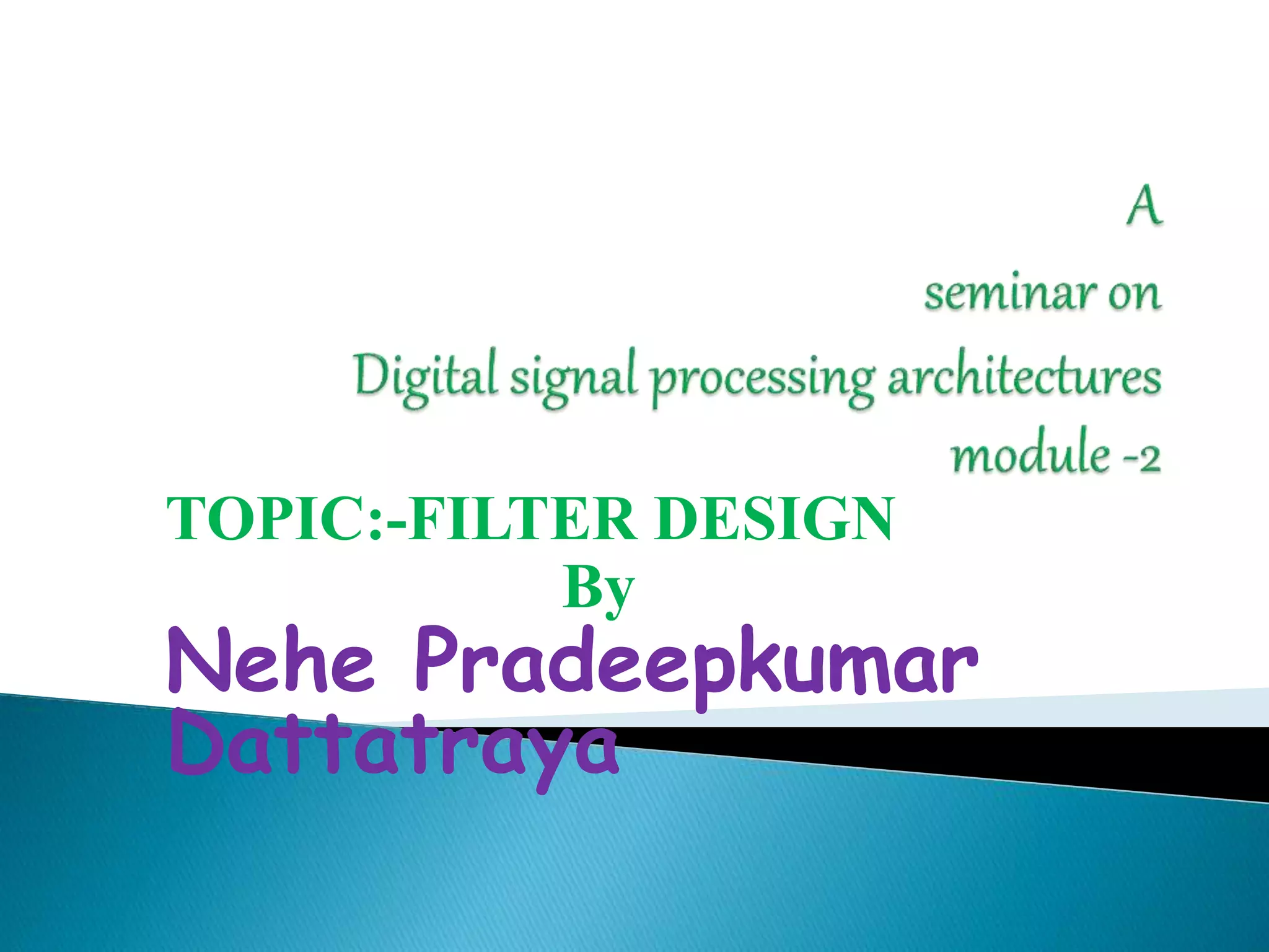 This document discusses different methods for designing digital filters, including FIR and IIR filters. It describes the impulse invariance and bilinear transformation methods for designing IIR filters, as well as frequency sampling techniques for FIR filter design. Advantages and disadvantages of FIR and IIR filters are provided. The key steps of the bilinear transformation method are outlined, along with discussions of designing linear phase IIR filters and specifying filters based on desired magnitude responses.