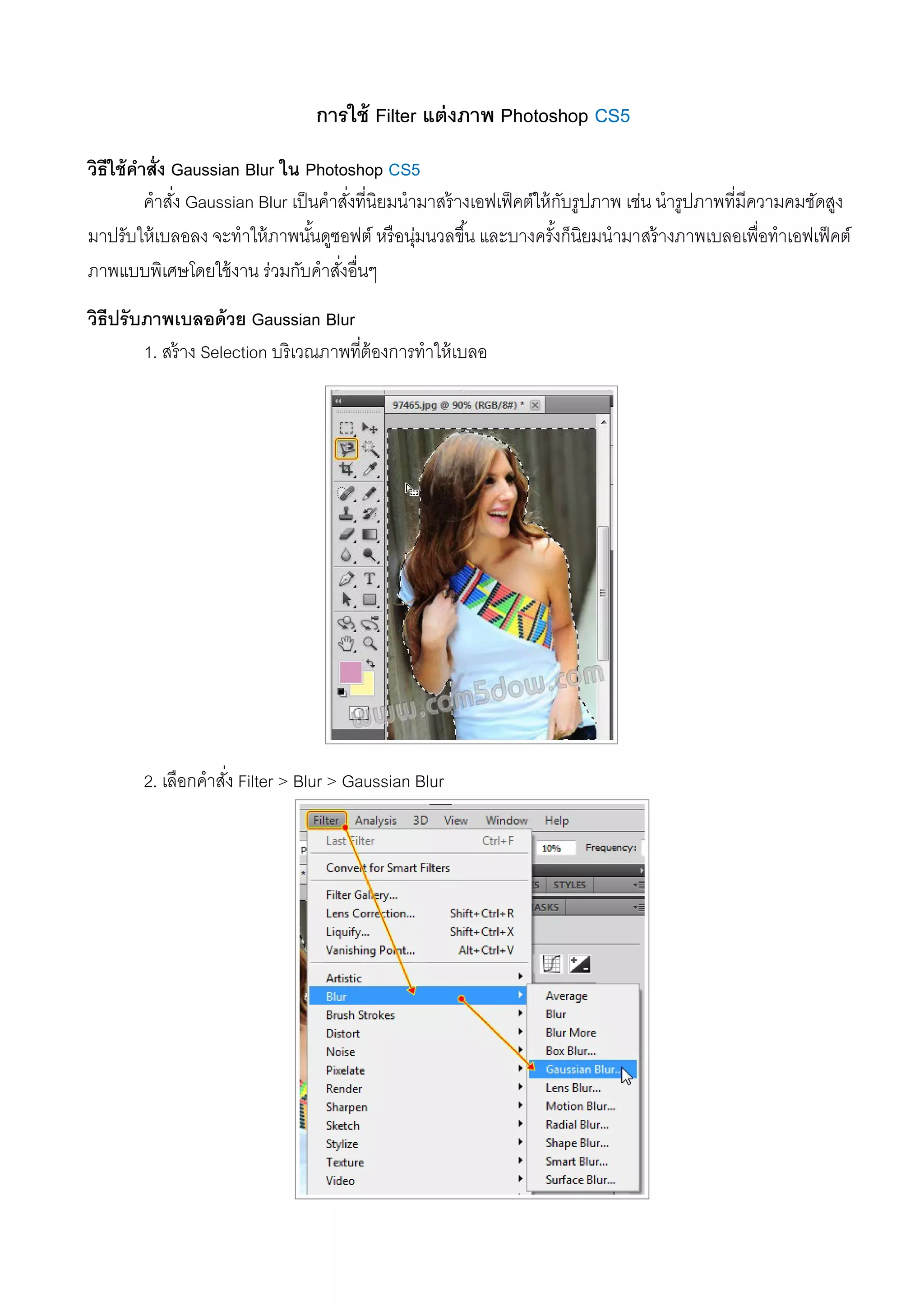 Photoshop CS5 วิธีใช้คําสั่ง Gaussian Blur ใน Photoshop CS5 คําสั่ง Gaussian Blur เป็นคําสั่งที่นิยมนํามาสร้างเอฟเฟ็คต์ให้กับรูปภาพ เช่น นํารูปภาพที่มีความคมชัดสูง มาปรับให้เบลอลง จะทําให้ภาพนั้นดูซอฟต์ หรือนุ่มนวลขึ้น และบางครั้งก็นิยมนํามาสร้างภาพเบลอเพื่อทําเอฟเฟ็คต์ ภาพแบบพิเศษโดยใช้งาน ร่วมกับคําสั่งอื่นๆ วิธีปรับภาพเบลอด้วย Gaussian Blur 1. สร้าง Selection บริเวณภาพที่ต้องการทําให้เบลอ 2. เลือกคําสั่ง Filter > Blur > Gaussian Blur
