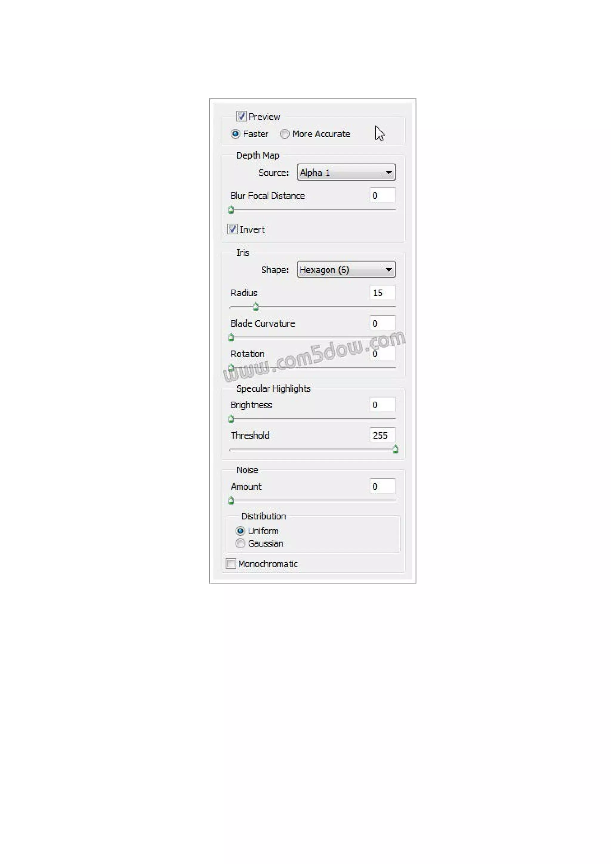 Preview: แสดงตัวอย่างการปรับ - Faster: แสดงภาพผลลัพธ์แบบรวดเร็ว - More Accurate: แสดงภาพผลลัพธ์จริง (ให้ผลลัพธ์แม่นยําแต่ช้า) - Blur Focal Distance: กําหนดระยะชัด หรือเบลอของภาพที่เป็นจุดโฟกัส - Source: เลือกพื้นที่อ้างอิง - Shape: เลือกรูปทรงให้ส่วนที่เลือกเบลอ - Radius, Blade Curvature, Rotation: กําหนดรัศมีความเบลอ ความคม และการหมุน - Brightness, Threshold: ปรับแต่งค่าความสว่างของภาพส่วนที่ทําเบลอ - Amount: เพิ่มจุด หรือ Noise ในภาพส่วนที่เลือกเบลอ - Uniform, Gaussian: รูปแบบของ Noise - Monochromatic: ให้แสดง Noise เป็นสีเดียว