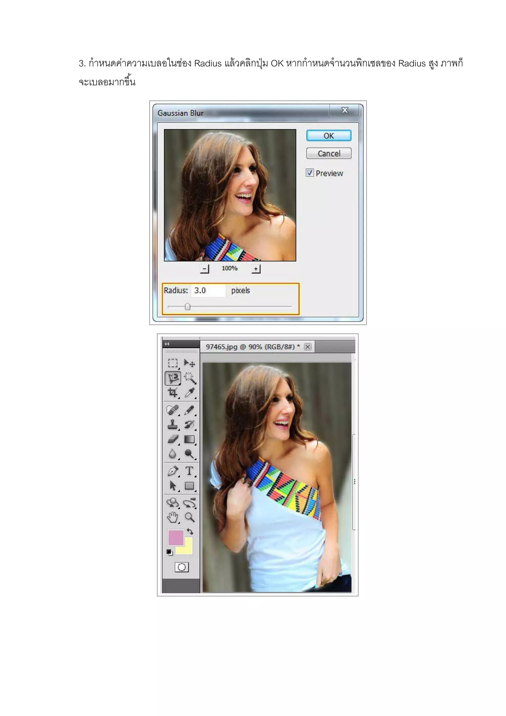 แล้วคลิกปุ่ม OK หากกําหนดจํานวนพิกเซลของ Radius สูง ภาพก็ จะเบลอมากขึ้น