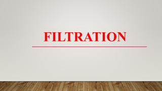 Filtration is a sterilization method that removes microorganisms from liquids and gases without exposing them to heat. It works by passing the substance through a membrane with pores small enough to block microbes. Key points: