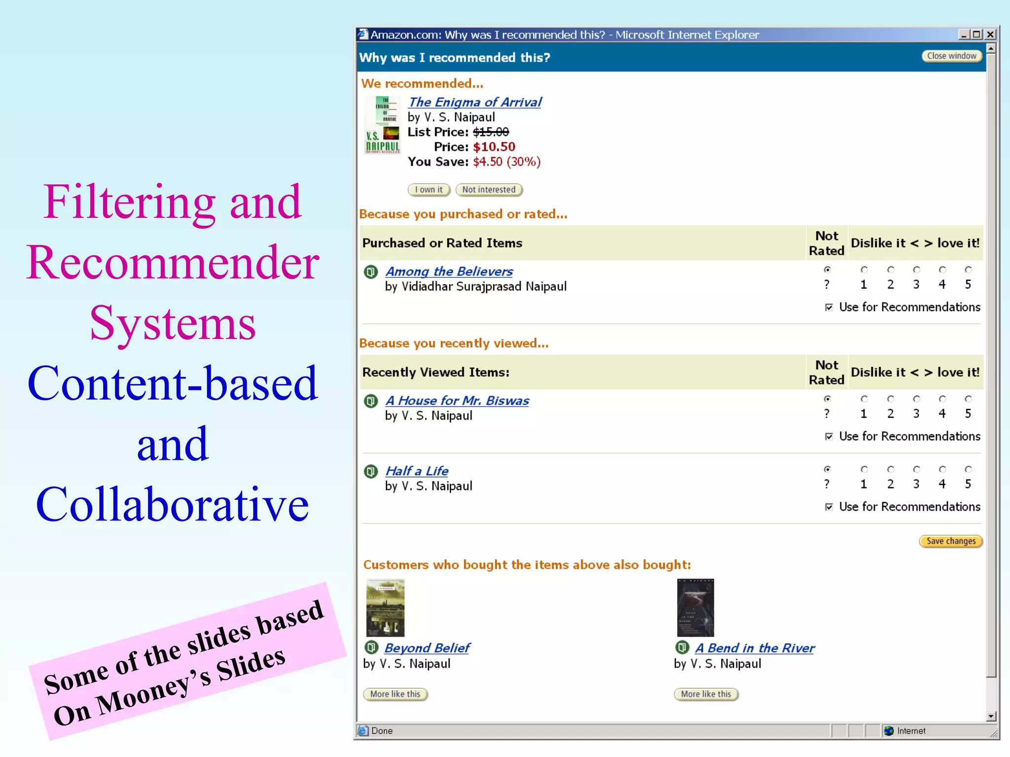 This document discusses various techniques for filtering and recommender systems, including content-based filtering, collaborative filtering, and hybrid approaches. It provides an overview of key concepts such as using user profiles and feedback to provide personalized recommendations. It also covers common recommendation algorithms like nearest neighbor collaborative filtering and discusses challenges like cold start problems and sparsity issues.