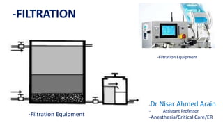 This document discusses various types of filtration equipment and processes. It describes filtration, clarification, and some basic terminology related to filtration. It then covers different types of filtration like surface and depth filtration. Various factors affecting the rate of filtration are discussed. Different mechanisms of filtration like straining, impingement, and entanglement are described. The document also discusses filter media, materials used as filter media, and selection of filter media. Finally, it provides details on various industrial filters used in pharmaceutical industries like filter presses, filter leaves, rotary filters, and membrane filters.