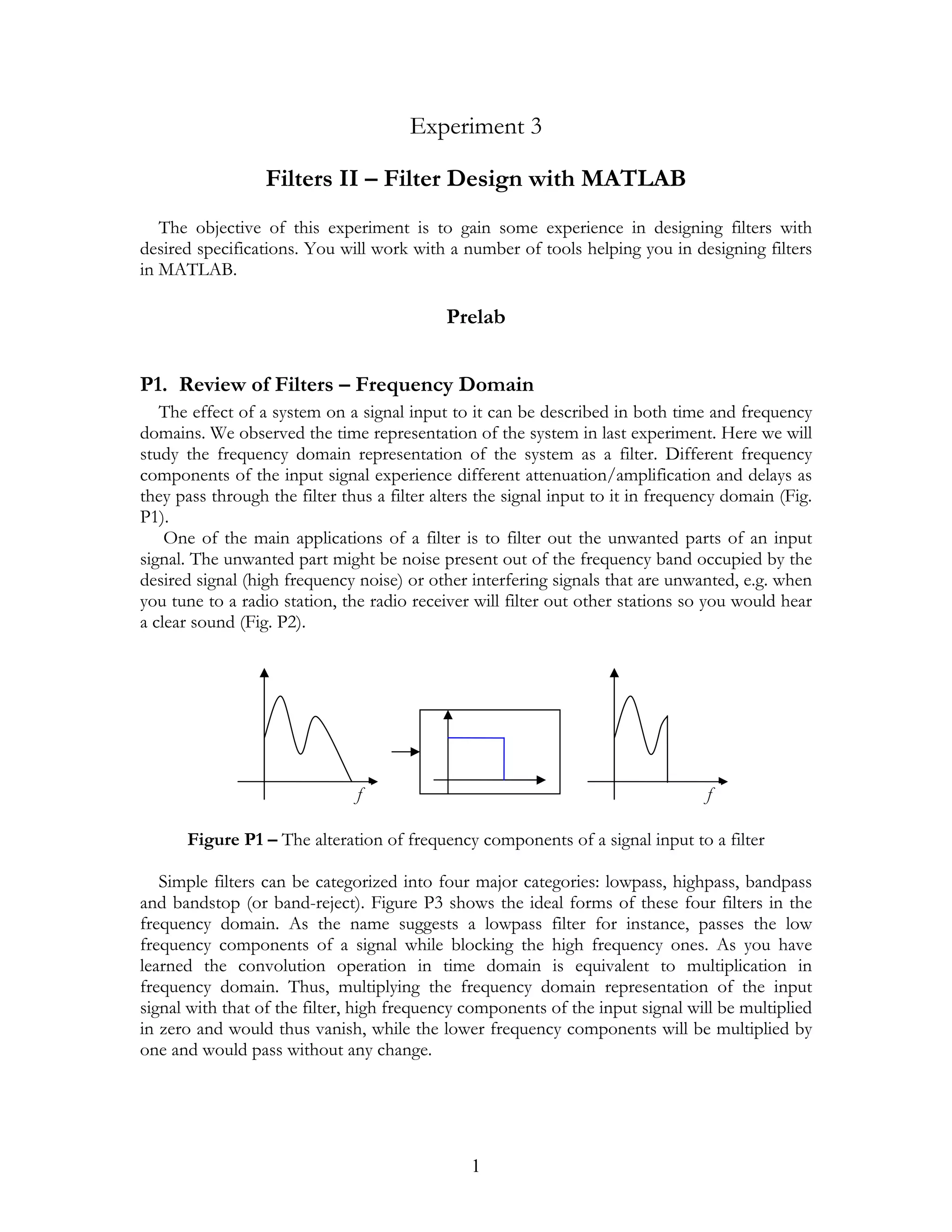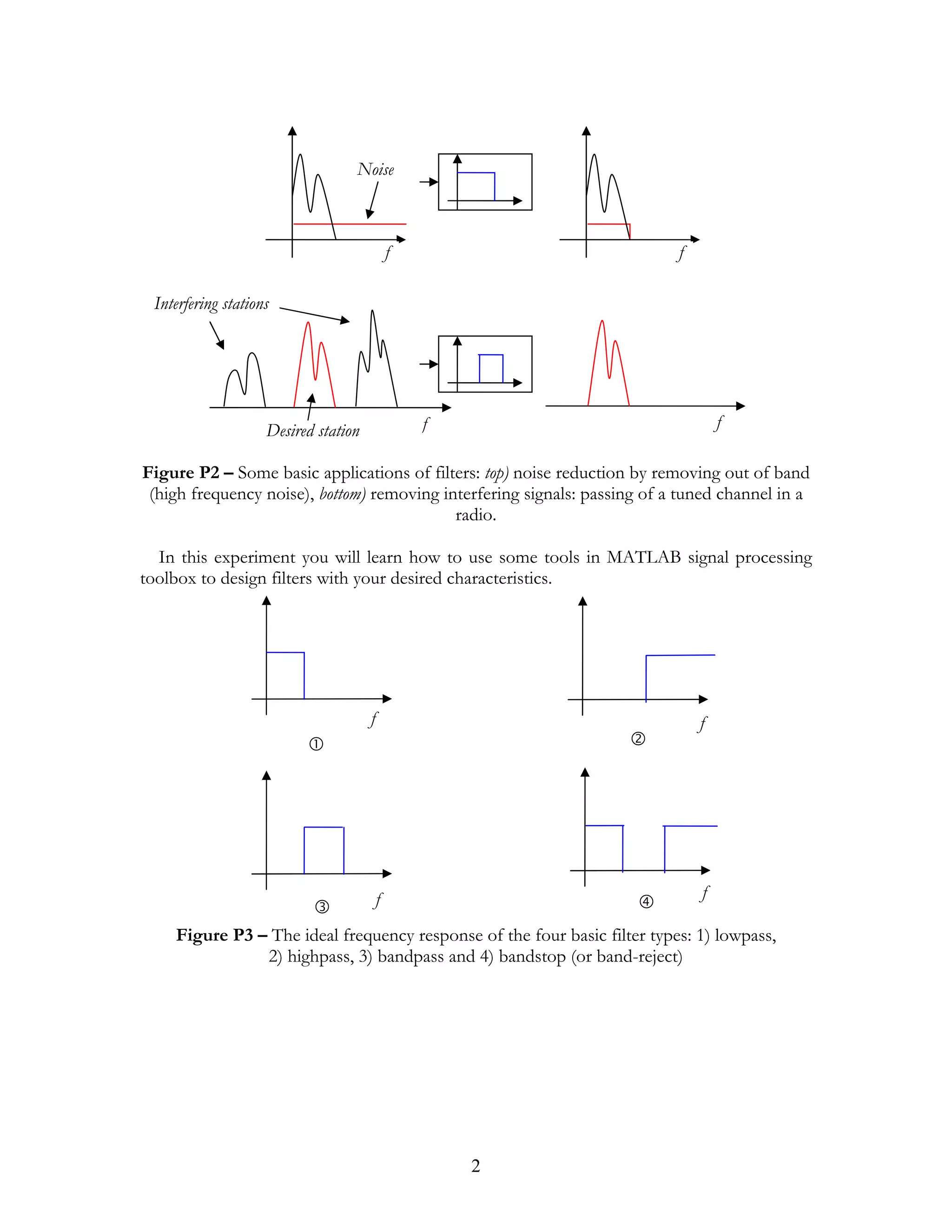 This document provides instructions for an experiment using MATLAB's signal processing toolbox (sptool) to design filters and apply them to audio signals. It begins with an overview of filters and their parameters. It then describes using sptool to design a bandpass filter to add a "phone effect" to a speech signal. Next, it demonstrates using a lowpass filter to remove high frequency noise from a noisy signal. Finally, it discusses exporting filter designs from sptool to MATLAB for further analysis and use.