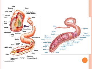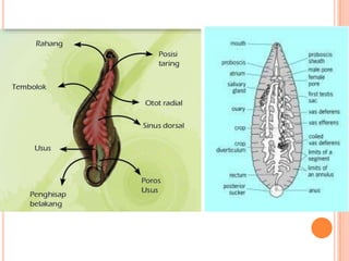Annelida memiliki ciri tubuh bersegmen, sistem pencernaan sempurna, dan sistem peredaran darah tertutup. Terdiri dari kelas Polychaeta, Oligochaeta, dan Hirudinea. Kelas-kelas ini berbeda dalam jumlah rambut dan parapodia mereka. Annelida memiliki peran penting seperti menyuburkan tanah, sumber makanan, dan zat hirudin yang berguna medis.