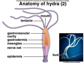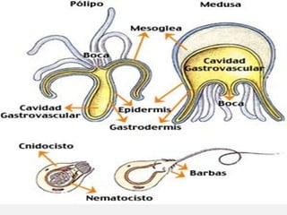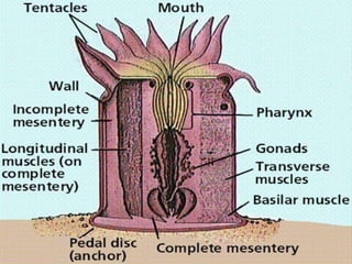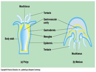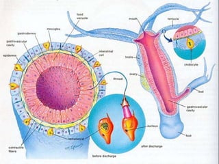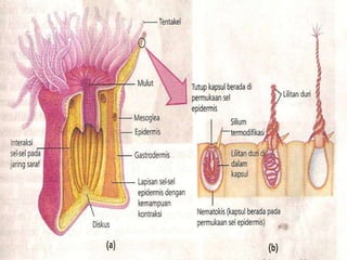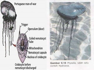 Coelenterata, atau cnidaria, adalah invertebrata dengan rongga tubuh yang berfungsi sebagai alat pencernaan dan peredaran makanan, serta memiliki sel penyengat di tentakel. Mereka memiliki dua bentuk utama, yaitu polip dan medusa, serta dapat bereproduksi secara aseksual dan seksual. Coelenterata memiliki peran penting dalam ekosistem, termasuk sebagai komponen terumbu karang dan objek wisata.