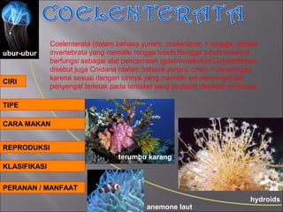 Coelenterata, atau cnidaria, adalah invertebrata yang memiliki rongga tubuh untuk pencernaan dan terkenal dengan sel penyengat pada tentakelnya. Terdapat dua fase utama dalam siklus hidupnya, yaitu polip (aseksual) dan medusa (sexual), serta dibedakan menjadi tiga kelas: hydrozoa, scyphozoa, dan anthozoa. Coelenterata memiliki peranan penting dalam ekosistem laut sebagai sumber makanan dan habitat bagi spesies lain.