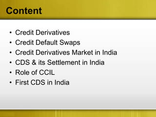 The document discusses credit derivatives and the credit derivatives market in India. It provides information on different types of credit derivatives including credit default swaps (CDS), credit linked notes (CLN), and credit spread options (CSO). It then discusses the growth of the CDS market globally and the composition of the credit derivatives market. It outlines the benefits of credit derivatives for banks and other financial institutions in India. Finally, it discusses the role of the Clearing Corporation of India in facilitating CDS trading and settlement and provides details on the first CDS trades in India in 2011.