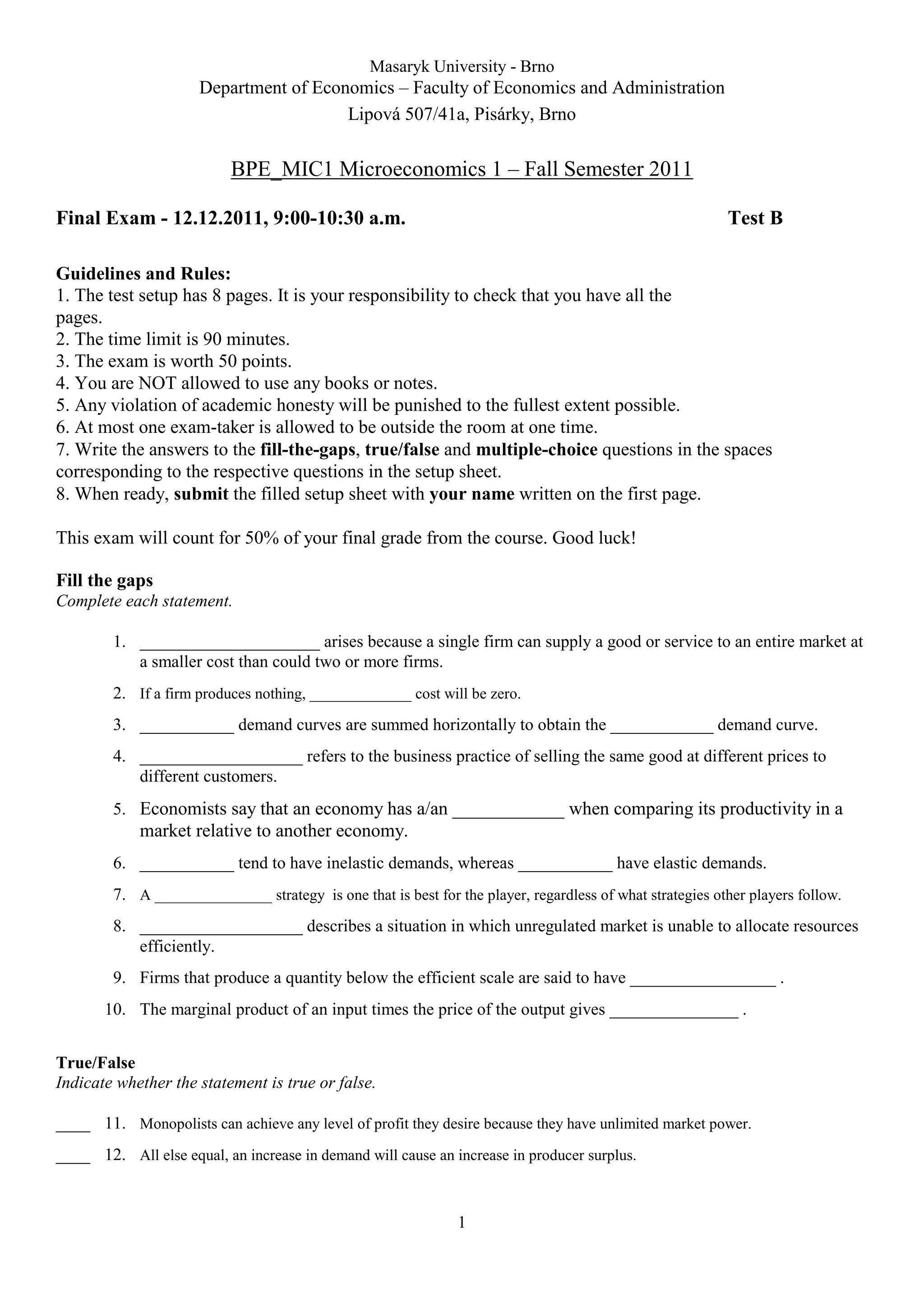 This document provides guidelines and rules for a final exam in Microeconomics 1 at Masaryk University. It states that the exam will be 90 minutes, cover 8 pages, and be worth 50 points. Students are not allowed to use books or notes and any academic dishonesty will be punished. The exam includes fill-in-the-blank, true/false, and multiple choice questions. This exam counts for 50% of the student's final grade in the course.