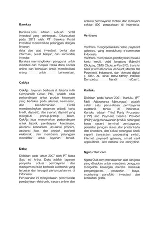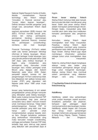 FinTech (Financial Technology) adalah inovasi dalam layanan keuangan yang mencakup berbagai jenis startup seperti pembayaran, pinjaman, investasi, dan pendanaan partisipatif. FinTech muncul pertama kali pada tahun 2004 dan mengadopsi konsep jaringan seperti peer-to-peer untuk menciptakan model keuangan baru dengan bantuan teknologi.