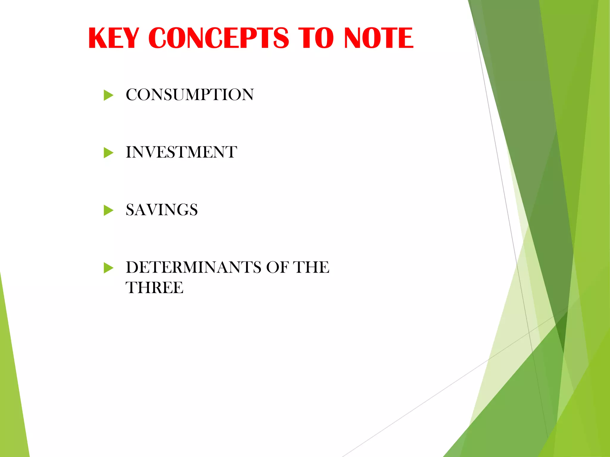 This document provides information on consumption, investment, and savings functions. It defines consumption as the use of goods and services by households. Investment is expenditures on capital goods for future income generation. Savings are disposable income left over after consumption expenditures. The key concepts of consumption, investment, savings, and their determinants are introduced. Formulas for the consumption function C=a+bY and investment function are shown. Factors influencing consumption, investment, and savings are discussed such as income, interest rates, and demographic trends. Case studies compare consumption functions in India and Iran.