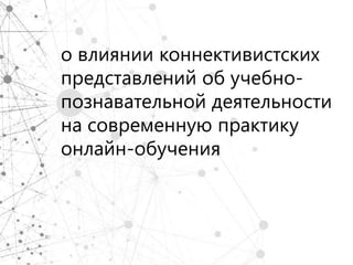 Документ рассматривает коннективизм как теорию обучения в цифровую эпоху, акцентируя внимание на важности связей и взаимодействия, как между обучающимся и компьютером, так и среди студентов. Упоминается о мета-обучении, где студенты осознают свою учебную деятельность и берут на себя ответственность за её регулирование. Также обсуждаются навыки, необходимые для выживания в современных образовательных условиях и роль учебной аналитики в оптимизации учебного процесса.