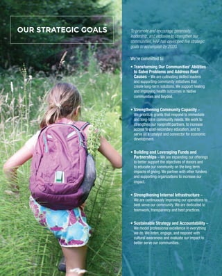 The document outlines Humboldt Area Foundation's strategic goals for 2020 which include transforming communities' abilities to solve problems, strengthening community capacity, building partnerships, strengthening internal infrastructure, and ensuring sustainable strategy and accountability. It discusses developing leaders, supporting community initiatives, strengthening nonprofits, increasing access to education, and serving as a catalyst for economic development.