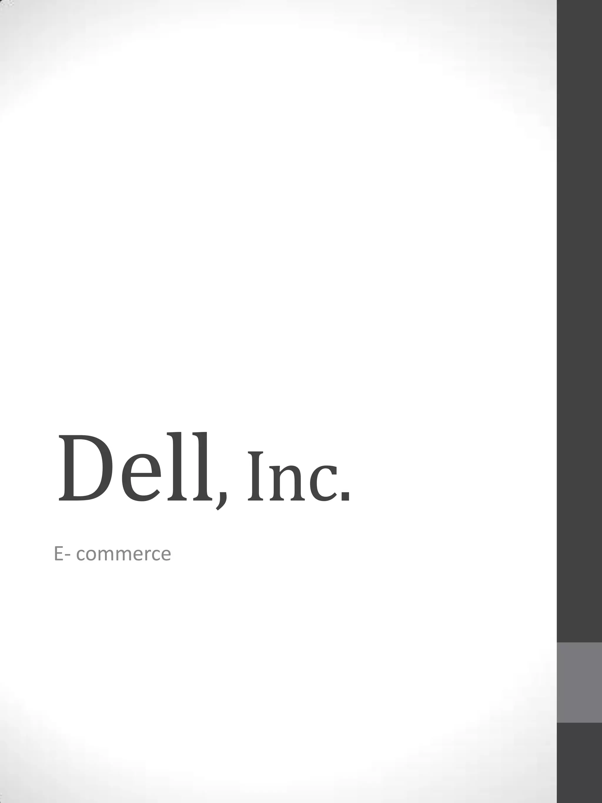 Dell Inc. is a global technology company that designs, develops, manufactures, and distributes computer systems. It has a diverse customer base that includes individuals, small and medium businesses, large enterprises, and governments. Dell pioneered direct sales online and was quick to adopt e-commerce processes, allowing it to automate operations and achieve $1 million in online sales by 1997. The company aims to globalize through e-business and targets 20% of the Asian market. Dell utilizes a build-to-order model and focuses on customer service, tailoring manufacturing to needs, and relationships with suppliers.